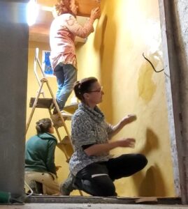 1 mail, 1 coup de fil et mi-décembre, me voici en visite pour un premier contact, juste 1 heure ou 2, avait-on dit… Je « croise » Michelle, et Sacha, puis quelques minutes plus tard Nico, qui travaille à la construction d’un logement passif. Le courant passe bien, et bam en ½ heure la décision est prise pour chacun : je reste pour 1 semaine … Et vous savez quoi.. j’y suis encore ! Je participe à la construction comme bénévole, Nico me confie volontiers des responsabilités à ma mesure : carrelage, enduits, et de multiples autres petites tâches qui lui « libère de la place de cerveau » comme il dit. C’est super valorisant même si parfois juste tenir l’éponge ne déclenche pas mon enthousiasme le plus vif… Je suis bien-venue ici, dans toutes les activités, et partout, avec chacun, de l’ouverture, de l’attention. Bien sûr chacun a ses propres bourrasques intérieures, et elles ont aussi la place d’être exprimées, ce qui crée un climat de paix dans lequel chacun évolue entendu, soutenu, et souverain. Ce qui permet autant au perfectionnisme de certains de côtoyer dans la joie la passion des autres, et de tenir ensemble bon quand les enfants s’encanaillent autour de la table commune, alors que les grands souhaiteraient continuer leurs discussions sans haut parleurs.